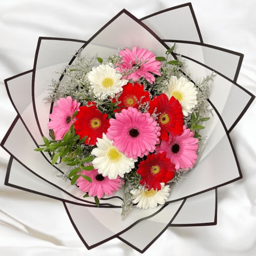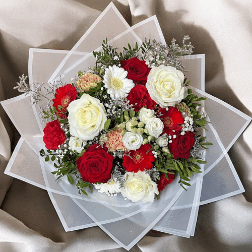 Ein wunderschöner Strauß aus roten Gerberas und Rosen in einer edlen Verpackung. Hinweis: Bitte beachten Sie, dass es bei Schnittblumen zu leichten Abweichungen in Farbe oder Sorte im Vergleich zur Abbildung kommen kann, da nicht immer alle Blumen verfügbar sind. Die Anzahl der Blumen bleibt jedoch gleich oder wird sogar erhöht. Niemals erhalten Sie weniger als den angegebenen Wert.